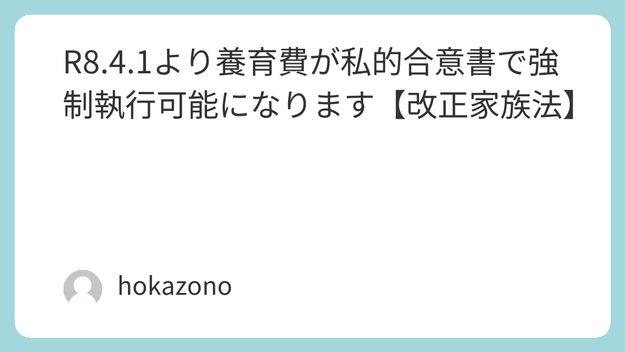執筆はR8.3.10ですが、このときは養育費の強制執行しようとすると、公正証書か調停調書、審判書のいずれかが必要になります。つまり私的合意書での強制執行はできないのですが、R84.1の家族法の改正により、私的合意書でも強制執行が可能となります。